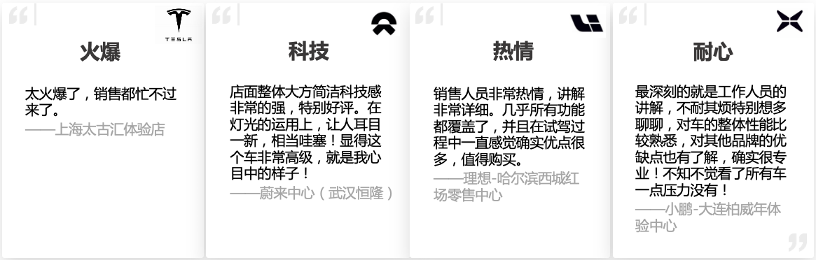 纵观客户正面反馈,造车新势力的直销门店有不少可圈可点之处,例如:销售人员表现出了相当高的专业水准,讲车细致、了解竞品,能很好传递产品卖点;在服务品质上也不输传统豪华品牌,态度热情耐心,并主动联系预约试驾;同时,受益于门店分布在各大商业中心,整体环境非常干净舒适。