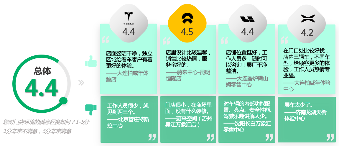 1、门店环境:蔚来兼备温馨感与科技感,满意度最高。