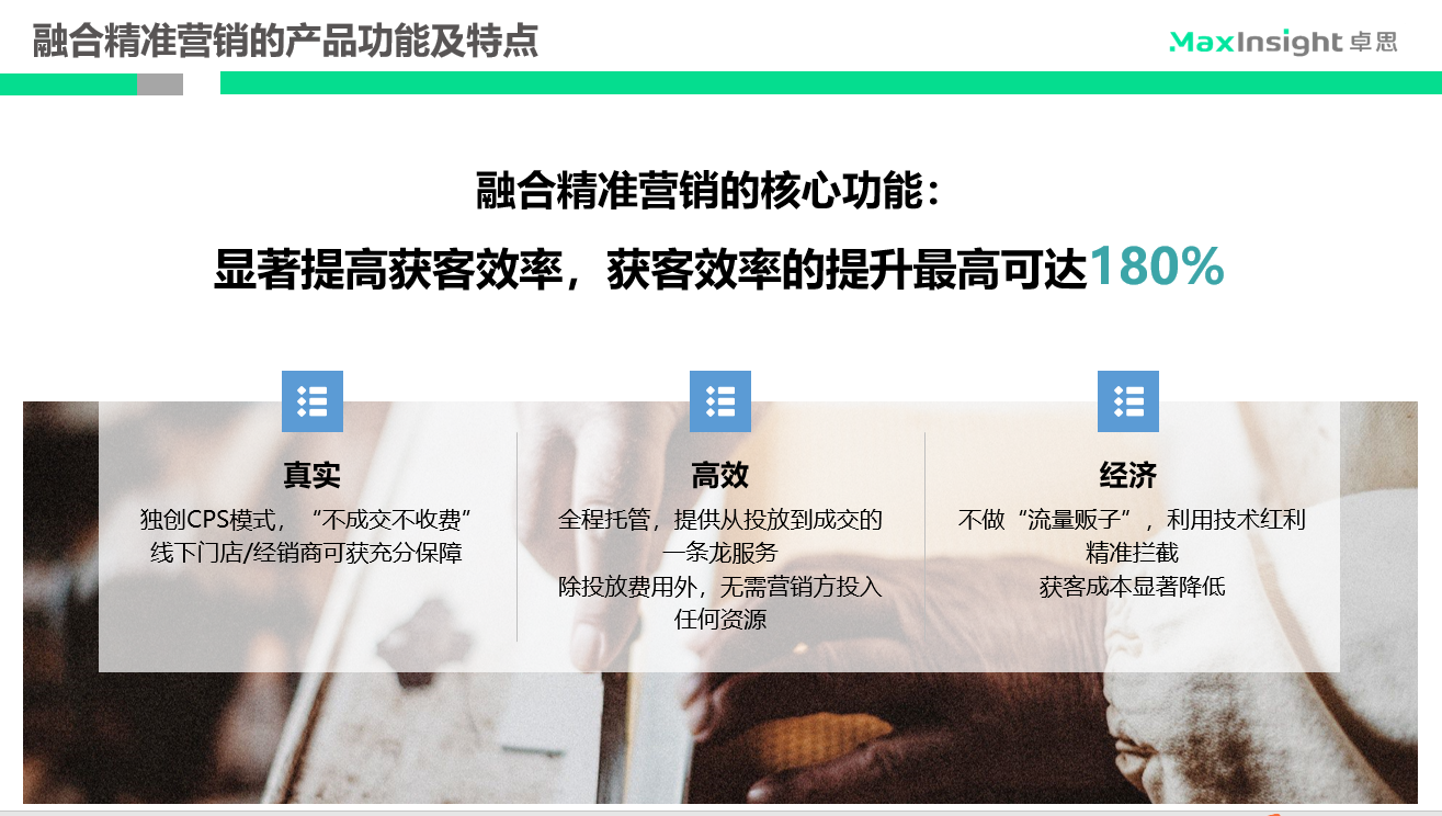 基于先进的AI算法和亿级实证营销数据,卓思搭建了目标驱动型的营销线索评价系统,能够实时、精准找出目标用户的潜在特征,大幅提升用户营销的准确性与触达率。以汽车行业为例,卓思基于对行业的深度了解,将千级类别、千万数量级的普适性用户标签转化为汽车行业语言,精准刻画细分市场人群画像、用户标签分类等,不仅可以为汽车厂商确定产品定位及营销方案提供参考,还可以为汽车厂商及经销商增加客流、提升线索转化率提供有效支持。根据卓思的研究数据,融合精准营销方案可使获客效率最高提升180%。