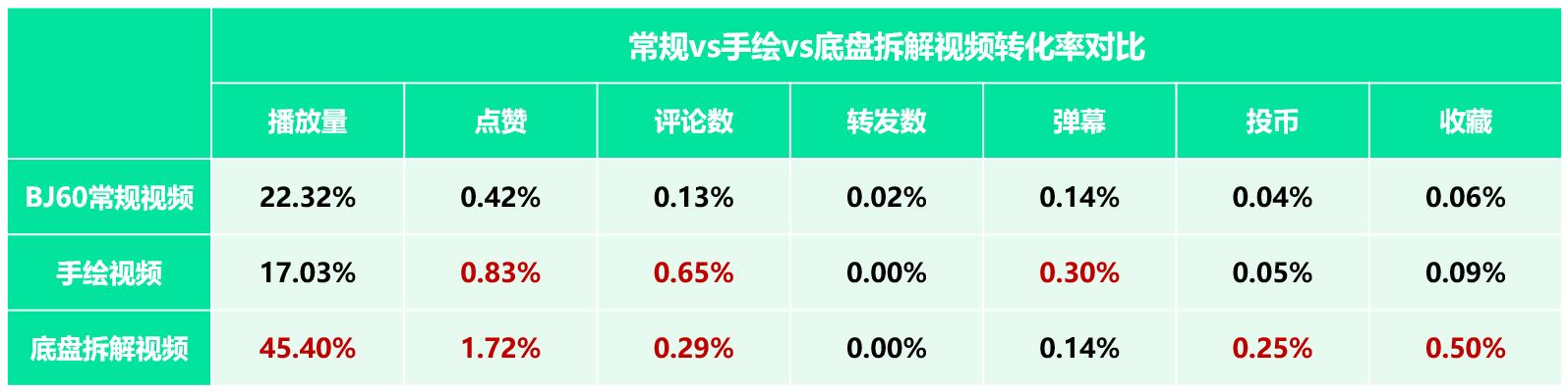 我们用以上数据与B站现任一哥——老番茄的播放数据进行对比发现,两者播放量和弹幕的转化率大体相近;在点赞、投币、收藏和转发等指标上,老番茄更强一些;而在评论转化率上,BJ60是老番茄的3倍以上。