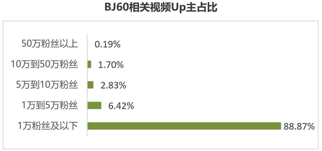 数据分析结果显示,在发布BJ60相关视频的Up主中,粉丝数达到10万(小银牌)的不足2%。