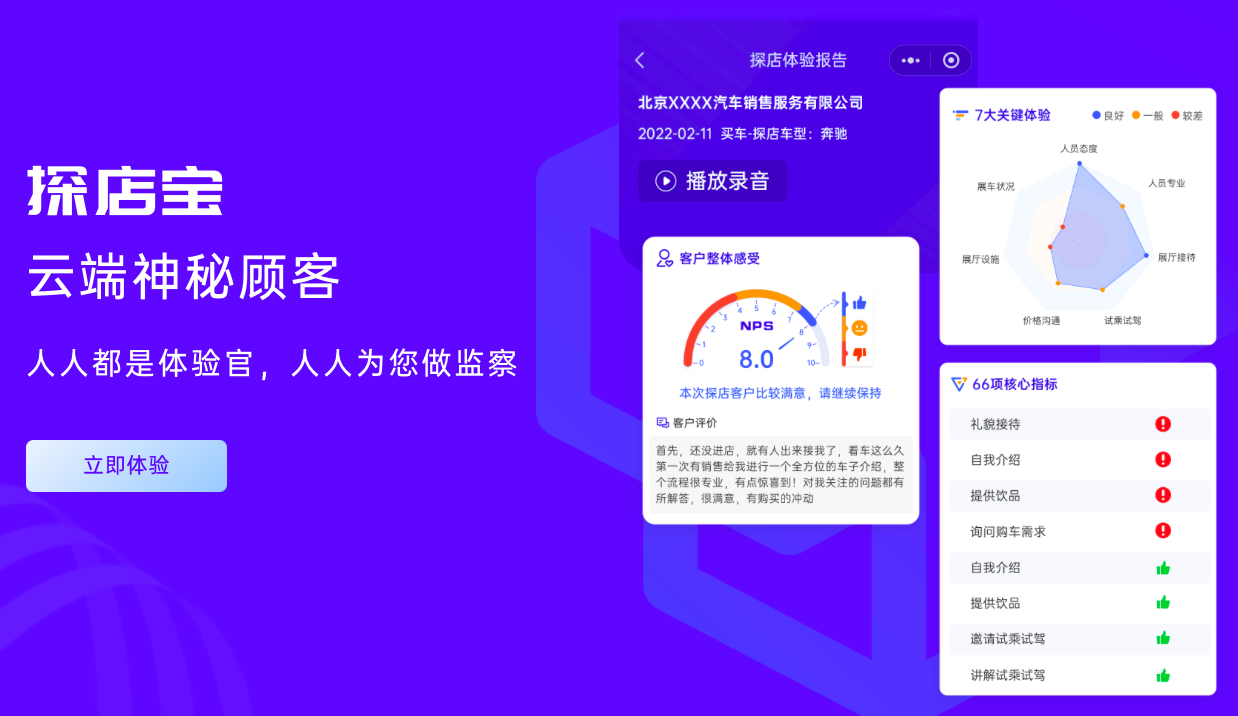 通常,神秘客检核的考核数量、流程、内容十分繁重,如专项检查、抽检、督导、巡查等,不少经销商在考核期间为了达标而达标,加班加点赶制材料。而且,传统神秘客检核通常由经过培训的审核员在规定时间里扮演真实客户,动辄需要在短时间内评价几十甚至上百个指标,不仅容易造成识别风险,还很难反应出真实的客户体验。