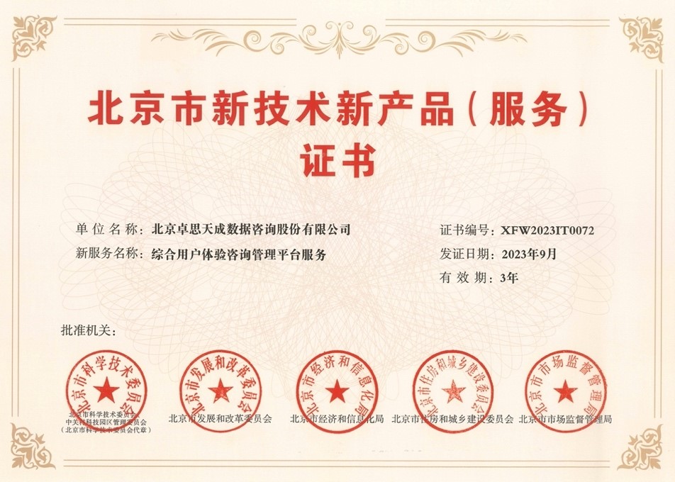 近日,北京卓思天成数据咨询股份有限公司(以下简称“卓思”)“综合用户体验咨询管理平台服务”凭借技术先进性、可靠性和创新性,获北京市科委、北京市发改委、北京市经信局、北京市住建委、北京市市场监管局、中关村管委会六大委办局的“北京市新技术新产品(服务)”认定。