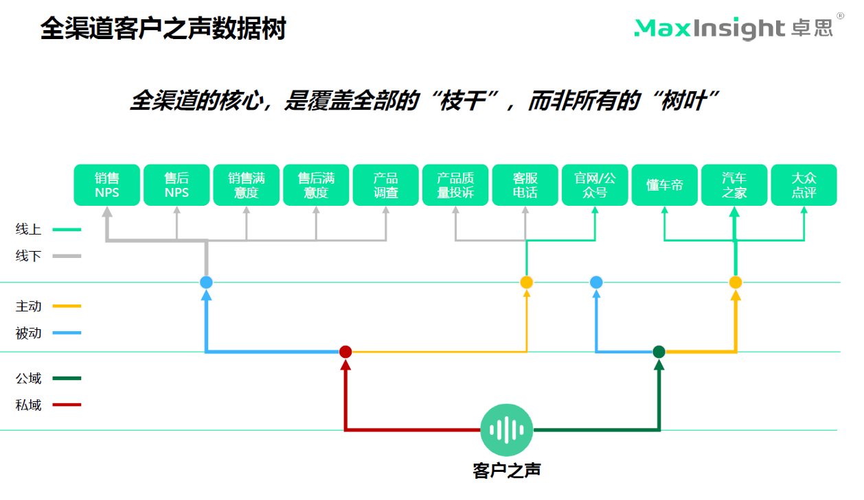 而全渠道客户之声中,最重要的就是企业的自有渠道数据。因为微博、微信、抖音等公域数据看似高频海量,但企业能基于此开展的行动非常有限,最多只是舆情管理层级。而私域数据,我们可以针对每个客户开展满意度提升和体验改善等。