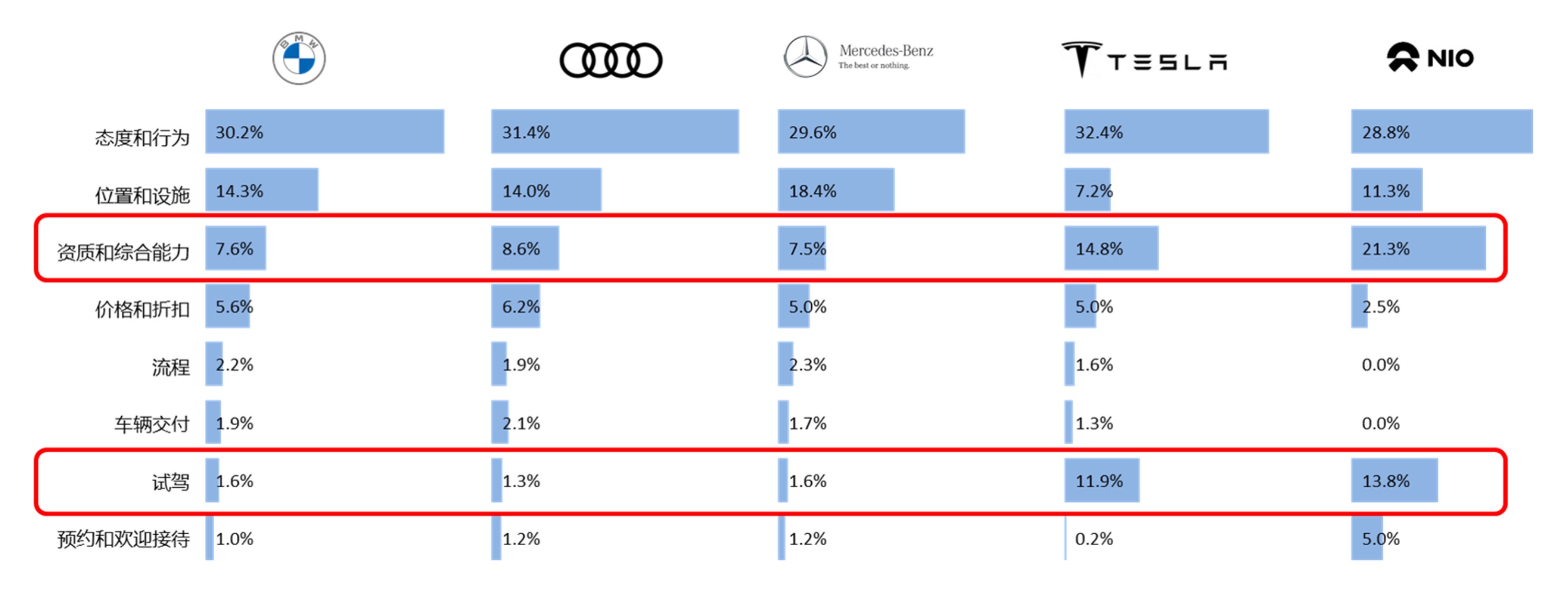上文中我们曾经引用过一个案例,从消费者对不同品牌终端销售服务的评价来看,电动车的销售人员在专业度(资质和能力)、产品展示(试驾)上全面领先;而燃油车的强项则包括“态度和行为”、“位置和设施”、“价格和折扣”、“流程”等。仅看这些指标的话,一家4S店和一家手机店或服装店毫无区别。