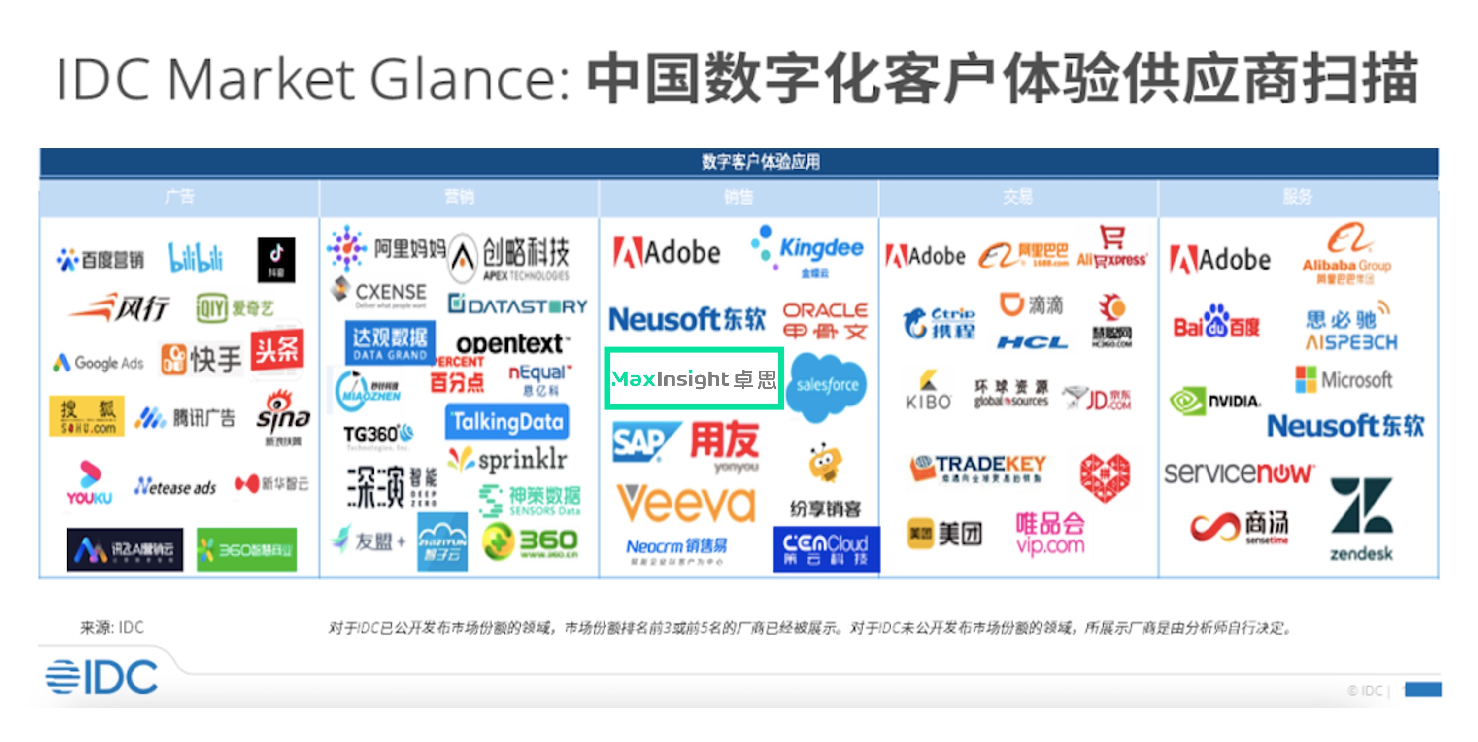 日前,国际数据公司(IDC)发布《Market Glance:中国客户体验供应商扫描》报告,遴选出了中国不同细分市场领域的主要技术服务供应商,并对其主要业务和能力进行评估,绘制出中国客户体验市场地图,北京卓思天成数据咨询股份有限公司(以下简称“卓思”)凭借突出的市场占有率、产品竞争力和品牌影响力,与甲骨文、Adobe、东软、金蝶、用友等一同入选。