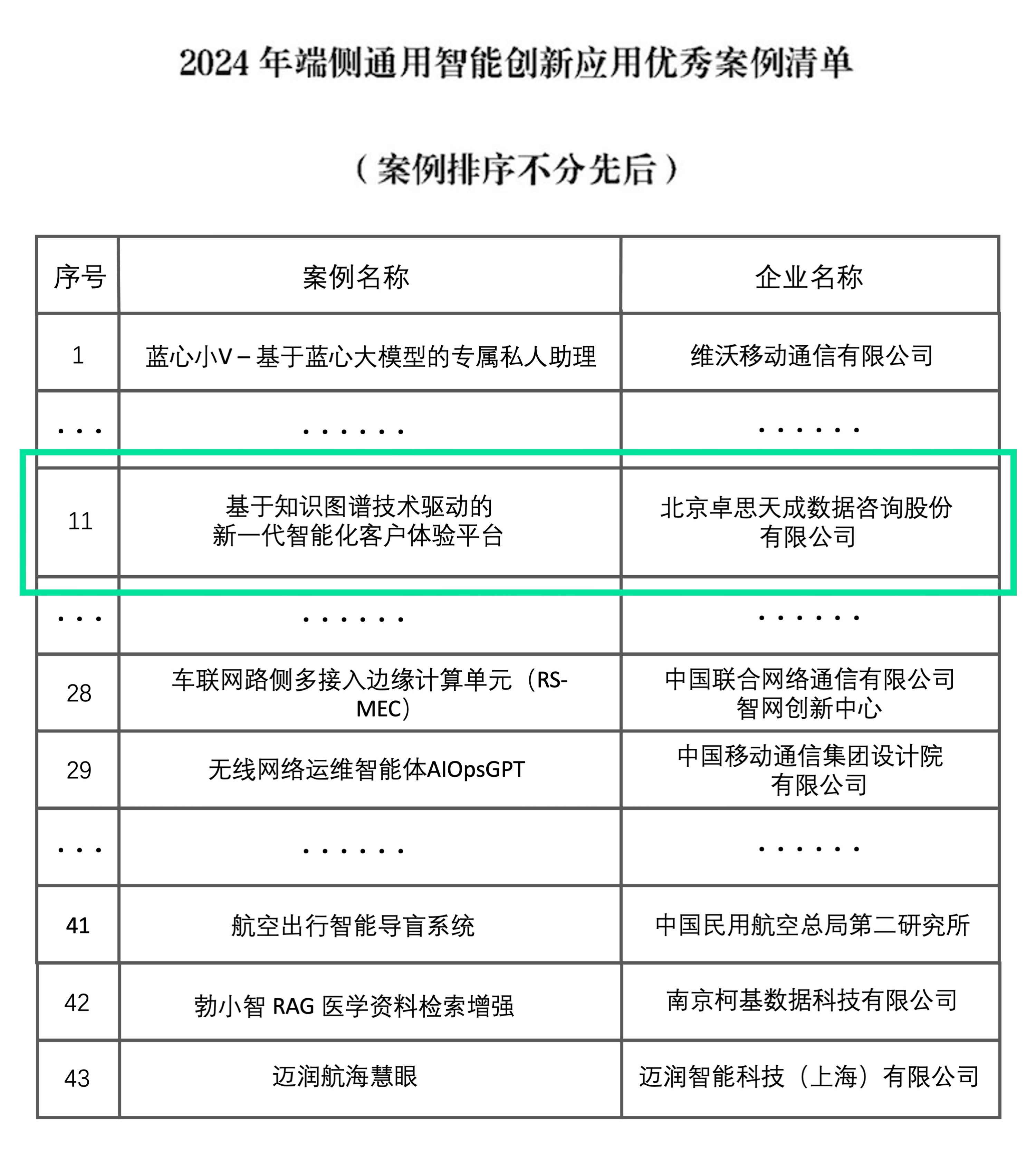 7月1日,中国信通院“2024年端侧通用智能创新应用优秀案例”名单正式发布,北京卓思天成数据咨询股份有限公司(以下简称“卓思”)“基于知识图谱技术驱动的新一代智能化客户体验平台”凭借技术先进性、创新性和示范性成功入选,成为CEM行业唯一上榜品牌。一同上榜的还有中国民航总局、国家新型显示技术创新中心、中国移动、金山办公等央国企、国家级技术创新中心及头部科技公司。