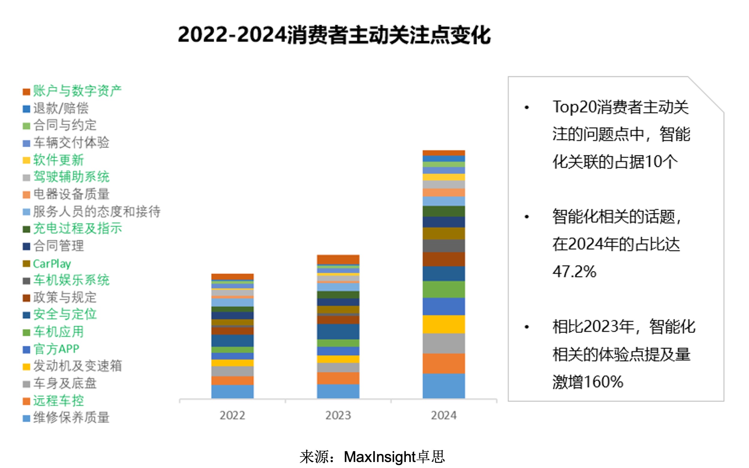 根据2024年的数据,智能化相关的消费关注度显著攀升。在消费者主动提及的20个核心问题中,智能化相关的内容占据了10个席位,几乎占据了所有关注点的一半。这种变化不仅反映了消费者对智能化功能的需求在快速增长,也显示出智能技术在提升客户体验指数(CXI)方面的巨大潜力。