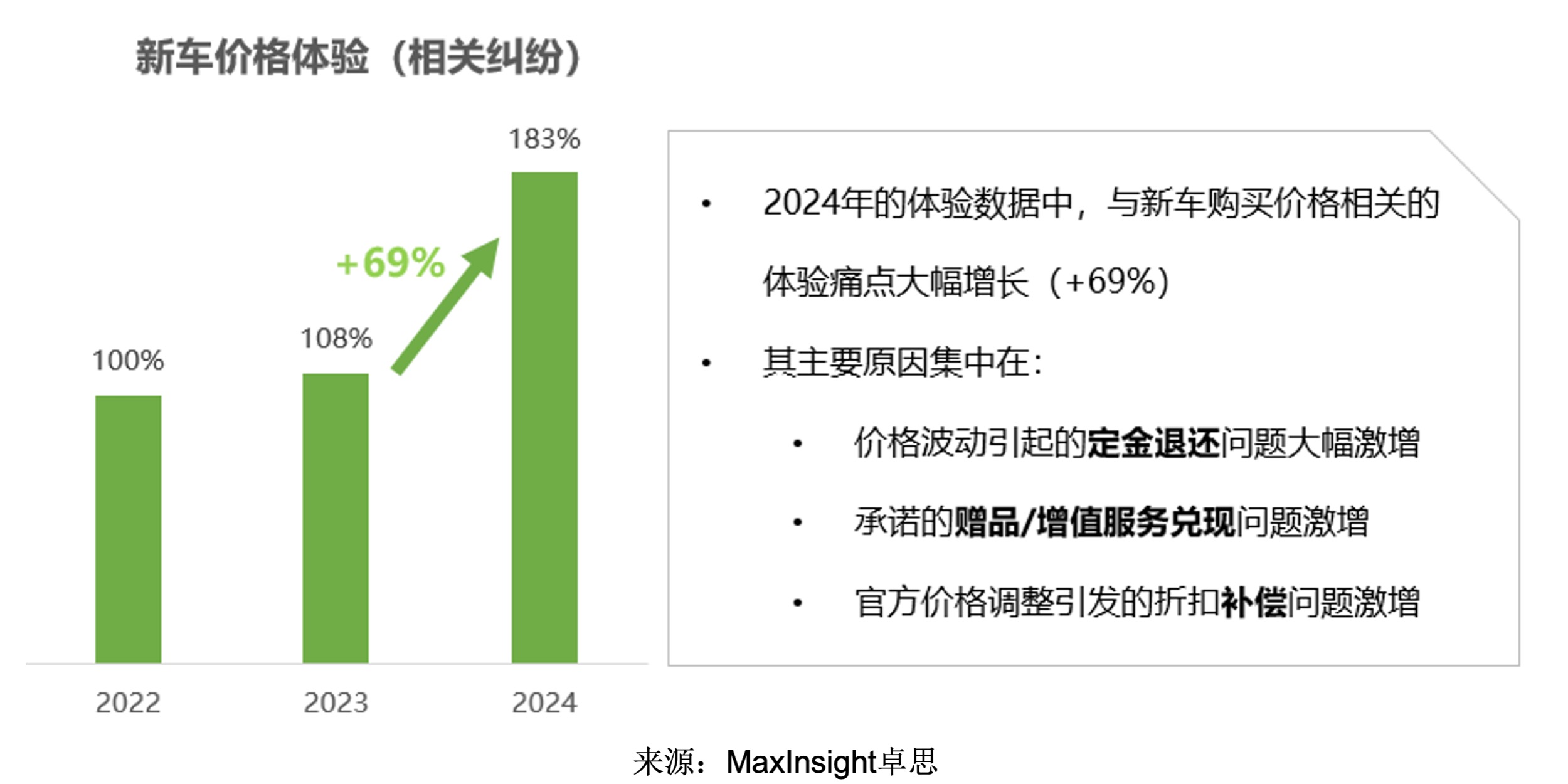 在过去几年中,汽车市场的价格波动加剧,消费者对于价格的敏感度也随之提高。2024年的数据表明,与新车购买价格相关的客户体验痛点显著增加,特别是由于价格波动引发的定金退还问题,以及因承诺的增值服务未兑现而导致的纠纷,成为消费者投诉的主要原因。