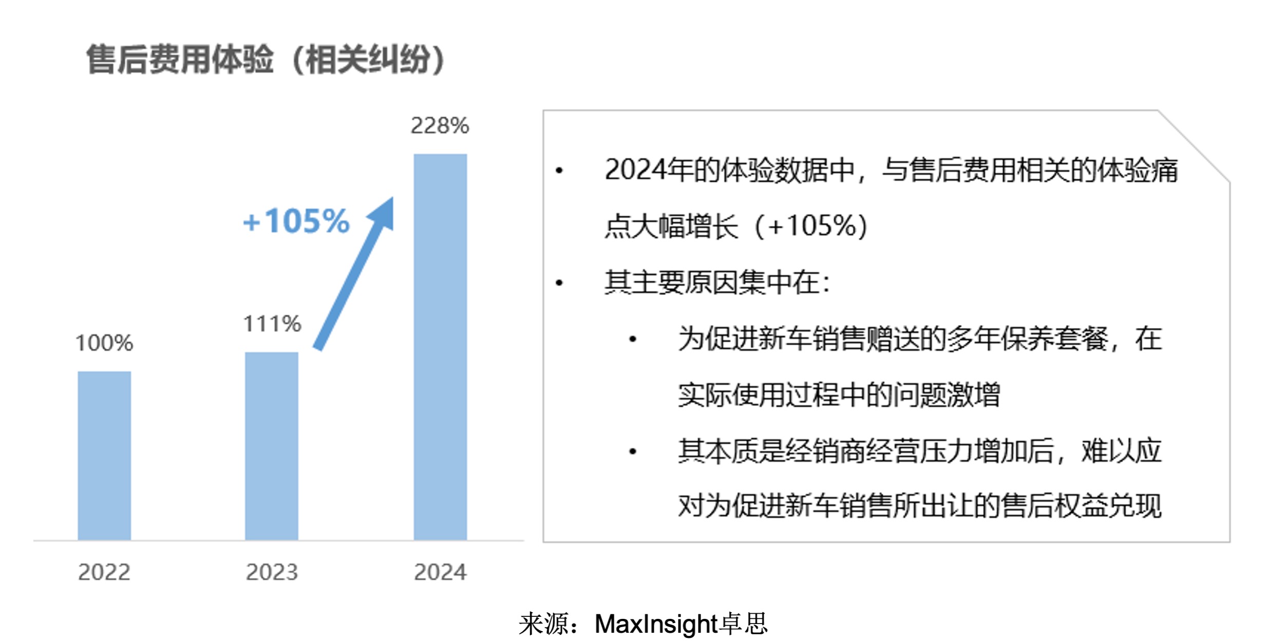 与售后费用相关的客户体验问题也在2024年显著增加,尤其是那些因多年保养套餐兑现问题而引发的纠纷。这一现象的本质在于,经销商在面临经营压力时,难以履行过去为促进新车销售所承诺的售后权益。