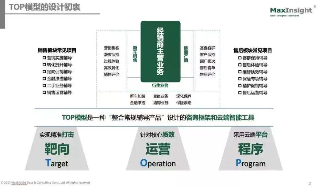 经过两年的应用,我们已经逐步完成了“TOP模型”全场景数据化工具的开发。2021年我们零售咨询板块正式推出“TOP模型”的升级版“云+数字化业绩解决方案”。我们希望通过在店端的各业务链上应用云端AI平台技术,实现四维云(云评估、云体检、云指导、云辅助)+策略,从而提升诊断效率、分析精度和改善效果,助力OEM(主机厂)和经销商获得更好的真实业绩。