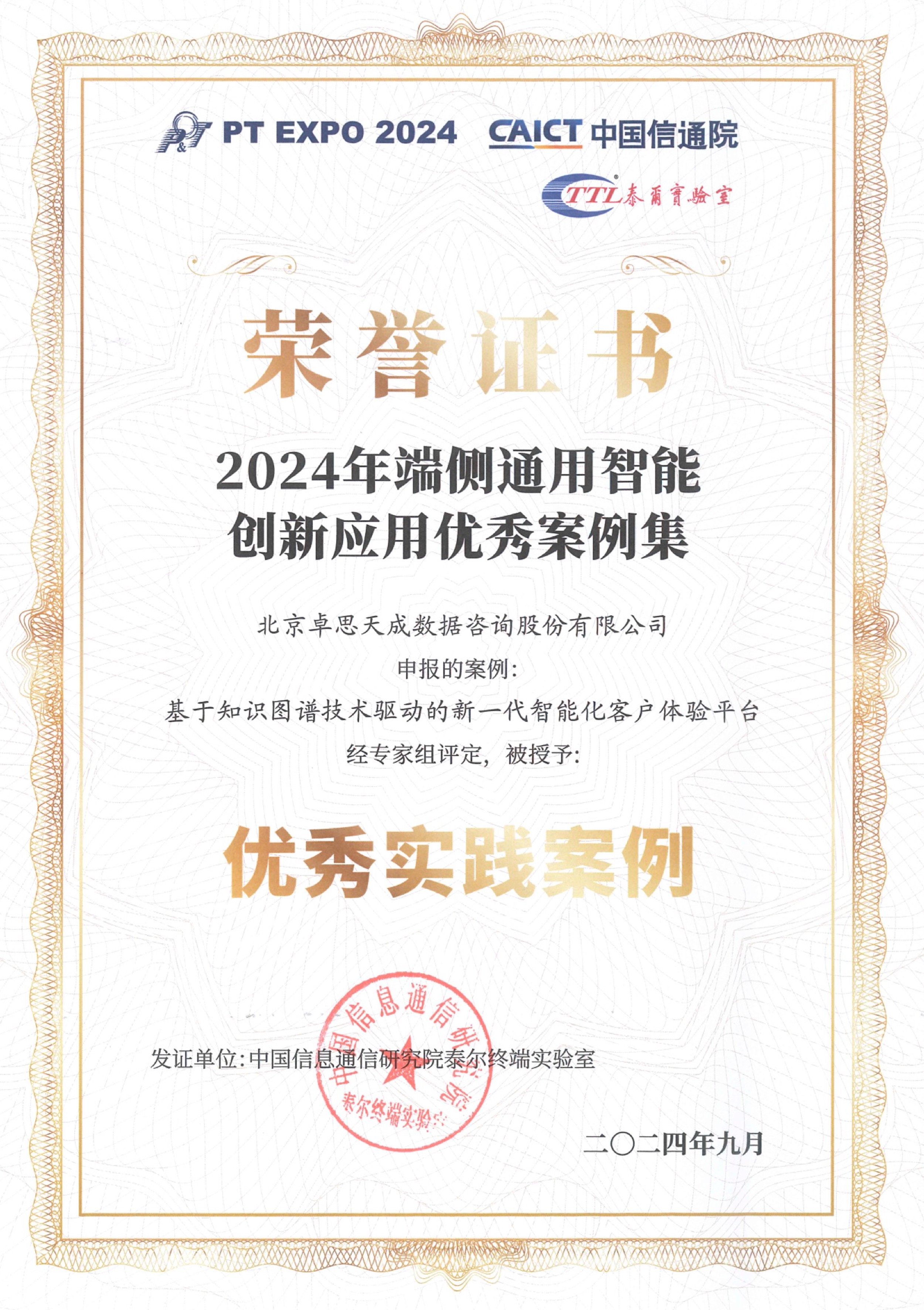今日,中国信通院在京举行“2024年端侧通用智能创新应用优秀案例”颁奖仪式,北京卓思天成数据咨询股份有限公司(以下简称“卓思”)“基于知识图谱技术驱动的新一代智能化客户体验平台”凭借技术创新性、引领性和示范性成功入选,成为CEM行业唯一上榜品牌。一同上榜的还有中国民航总局、国家新型显示技术创新中心、中国移动、金山办公等央国企、国家级技术创新中心及头部科技公司。