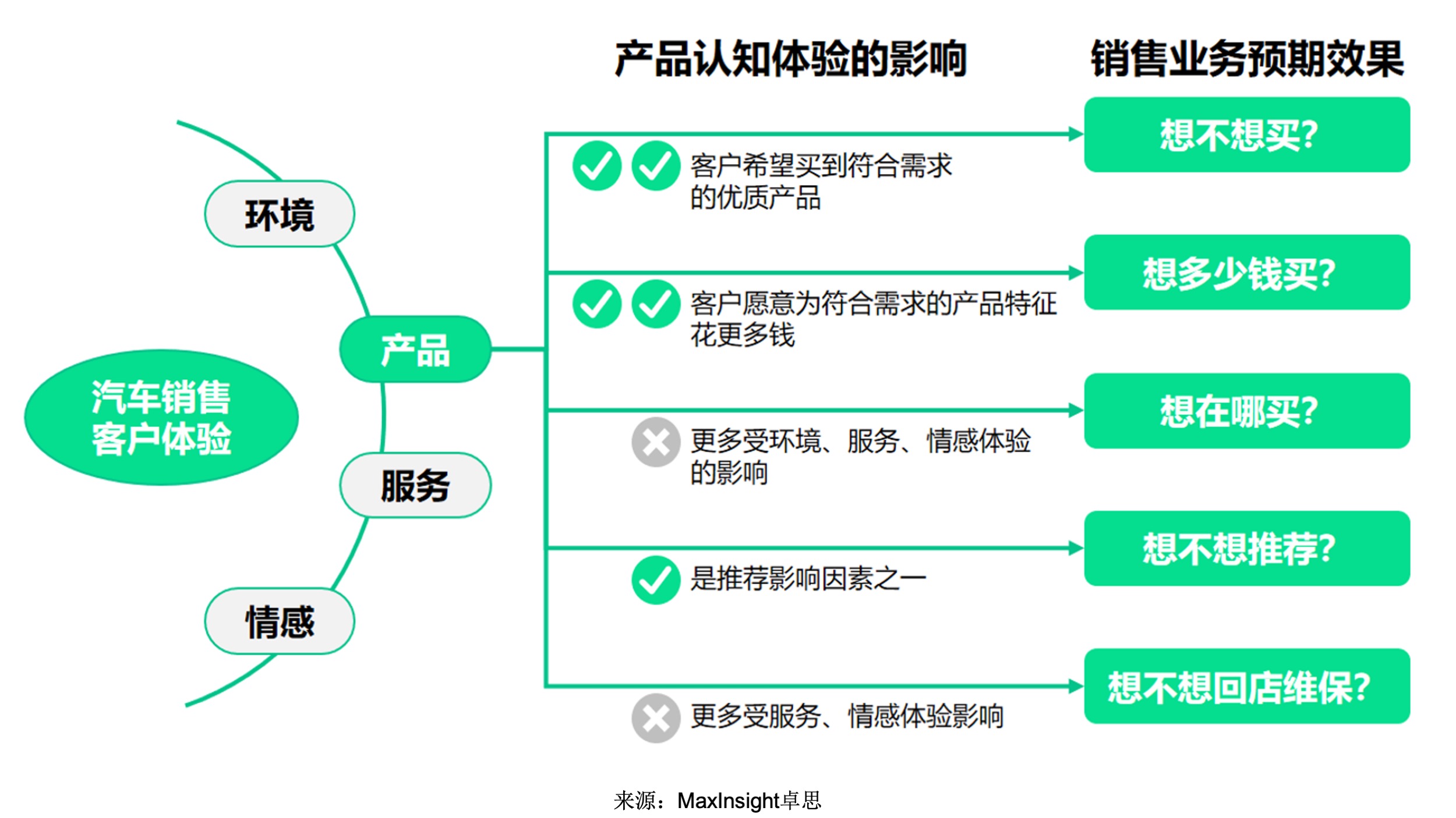 从这个角度来看,产品认知体验在销售体验中具有最高的提升优先级,其次是环境、服务和情感体验。客户对产品认知体验的差异,直接决定了客户是否想买这款车以及愿意花多少钱购买,而其他体验对此影响较小,更多是决定了客户是否愿意在这家店购买汽车。