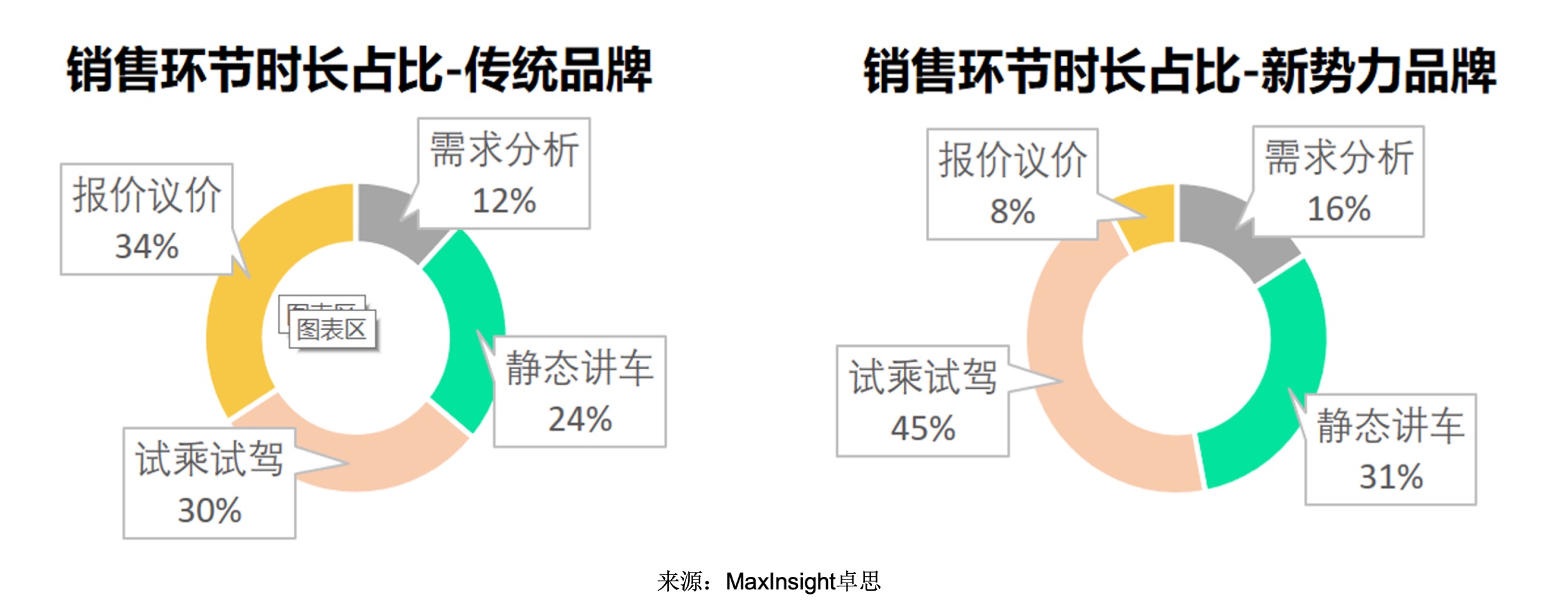 而新势力品牌则与传统品牌有很大不同,一线销售人员更侧重静态讲车和试乘试驾,报价议价时长占比仅为8%。这一方面源于直营模式的特点,全国统一售价,门店之间竞争关系相对较弱;另一方面也来自于产品特点对销售动作的倒逼,新势力品牌的车型往往在智能化配置、舒适性配置方面有其独特之处,销售人员引导客户体验得越深入,客户的成交意愿就越高。