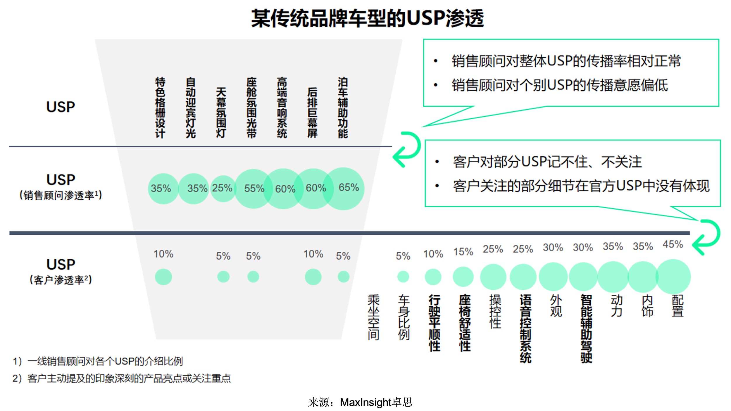在USP传播方面,传统品牌存在的主要问题是对自家产品卖点的定位没有很好地契合客户真正的关注点,这一点在一些本土化程度较低的豪华品牌身上体现得尤为明显。主机厂制定的卖点依然是迎宾灯光、氛围灯、高端音响系统等一些传统卖点,所有的销售话术培训也围绕这些卖点展开,但实际上当前客户更关注的是智能辅助驾驶、智能语音控制以及所有座椅是否都配备了通风加热按摩等功能,这种错位导致客户对销售顾问所讲的内容缺乏兴趣,效果自然也大打折扣。