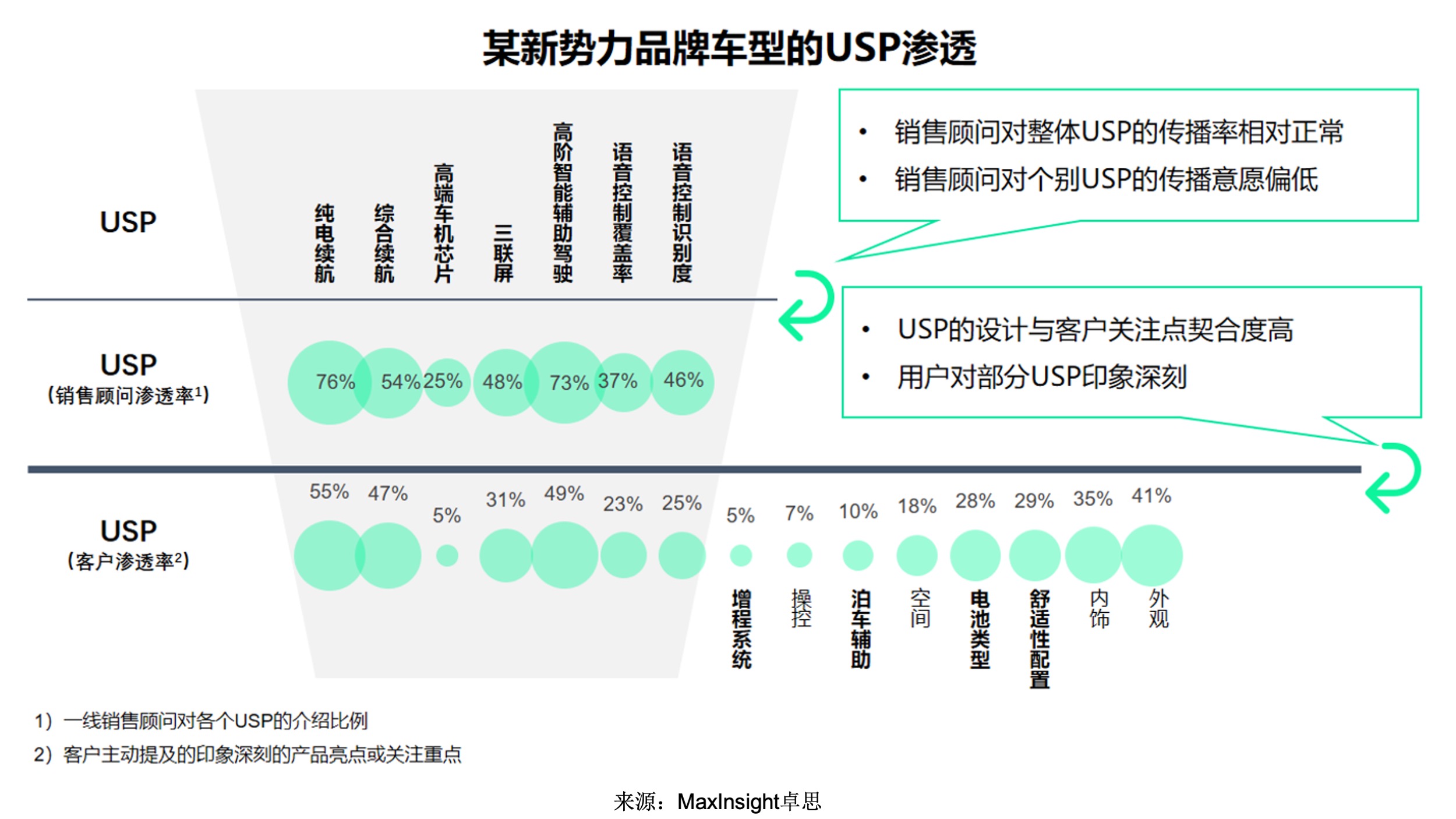 反观新势力品牌,显然更了解中国市场的客户,设计的产品卖点基本都能契合客户关注点,这使得销售人员在产品静态和动态介绍中所付出的每一分努力,都能在客户购买决策的天平上加一个砝码,即使个别卖点的设计与客户需求出现偏差,销售人员也能根据客户反馈做出适当调整。例如,观察某新势力品牌产品在USP渗透漏斗中的表现可以发现,对于续航里程、智能辅助驾驶这些客户关注度高的卖点,销售人员主动介绍的比例也较高;而对于高端车机芯片这种客户不关注的配置,虽然也在卖点清单中,但销售人员会自发地降低其讲解比重。