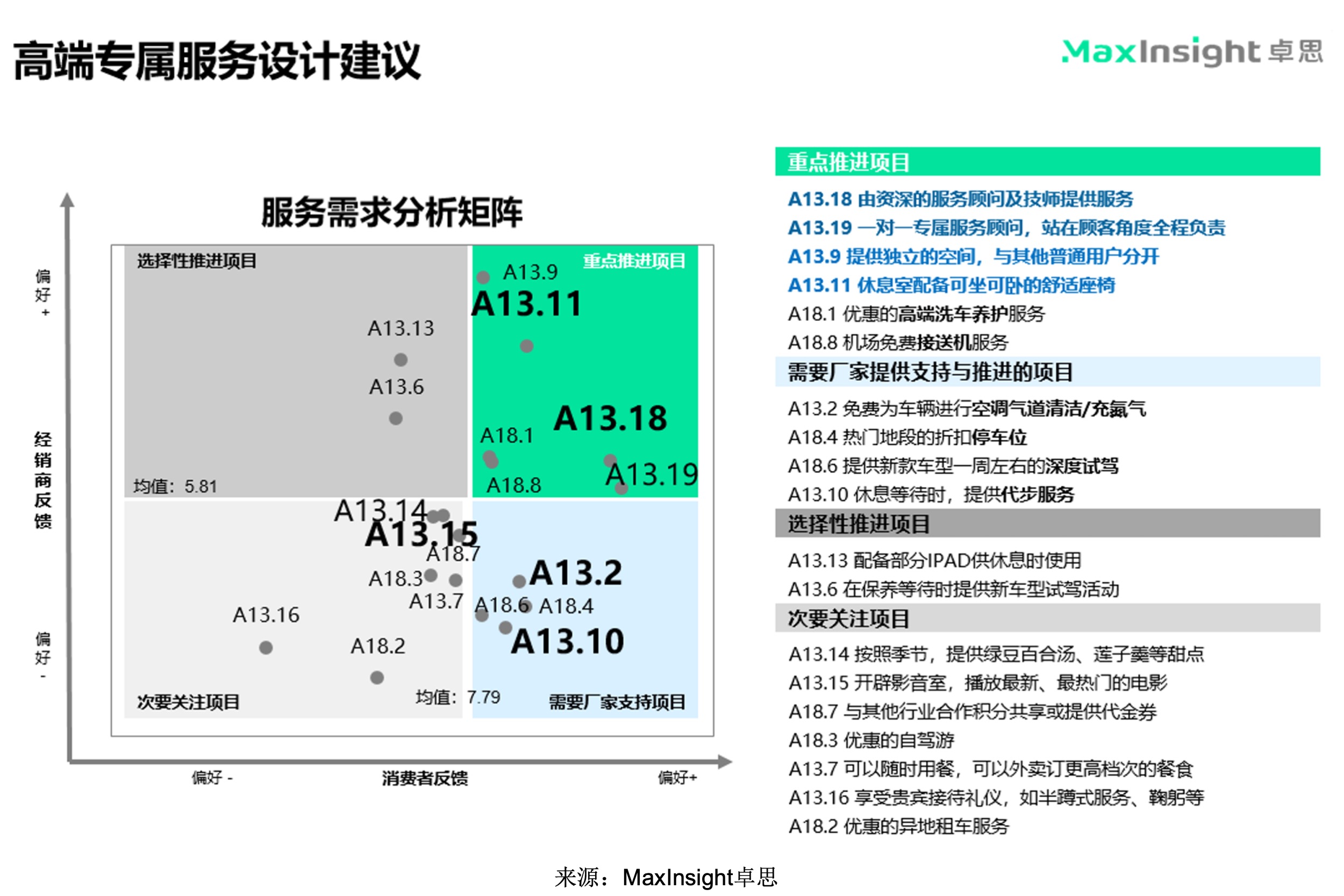 1)高端专属服务:重点推荐项目包括由资深的服务顾问及技师提供服务、一对一专属服务顾问对顾客全程负责、提供独立空间、休息室配备可坐可卧的舒适座椅等;需要厂家提供支持与推进的项目包括免费为车辆进行空调气道清洁/充氮气、热门地段的折扣停车位、提供新款车型一周左右的深度试驾等;选择性推进项目包括配备IPAD供休息时使用、在保养等待时提供新车型试驾活动等;次要关注项目包括开辟影音室播放热门电影、与其他行业合作积分共享或提供代金券等。