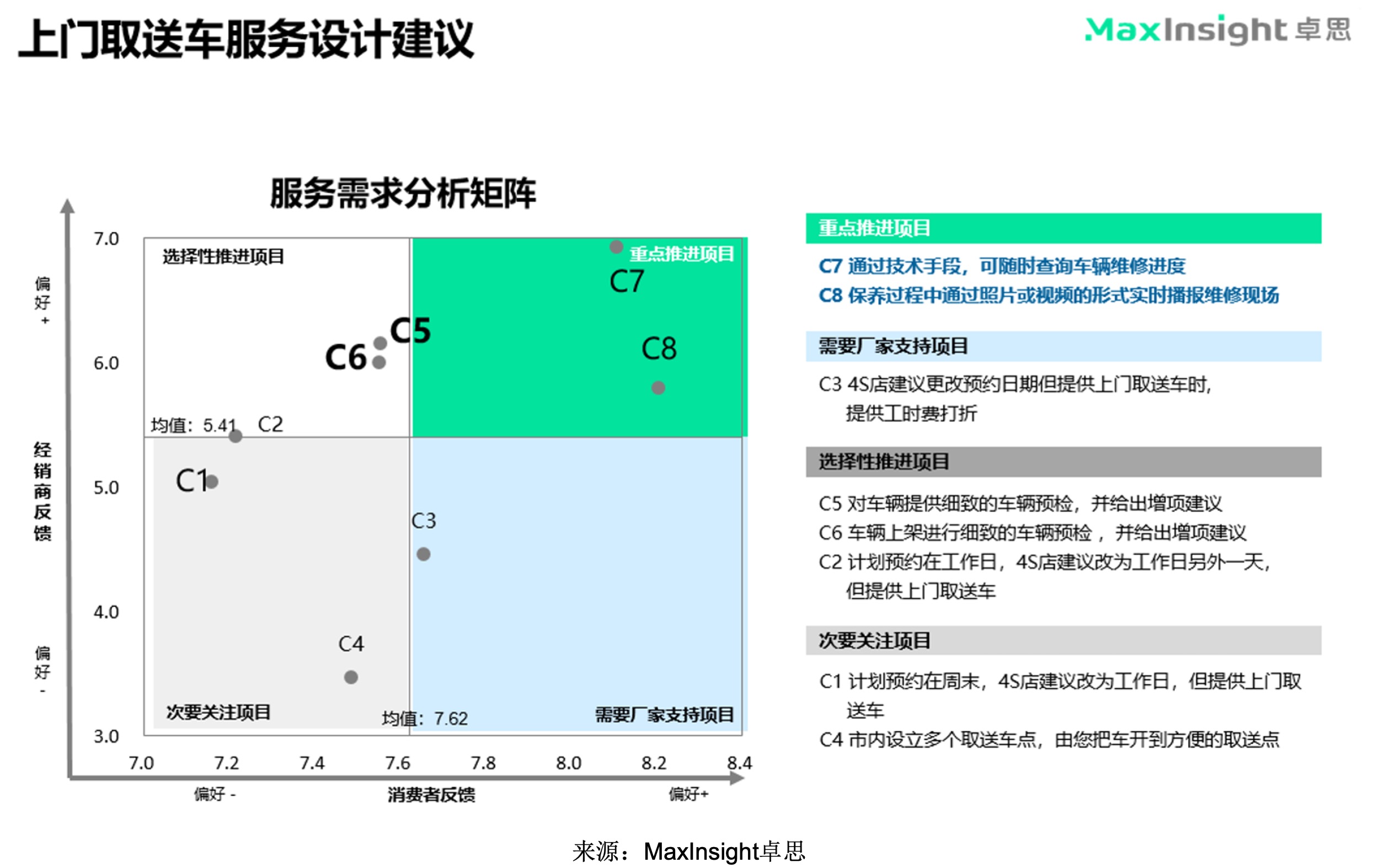 卓思在此次研究中发现客户期望最高的四大方向分别为:高端专属服务、上门取送车服务、人性化服务,灵活保养服务,其中前两项为增值服务,后两项为基础服务。