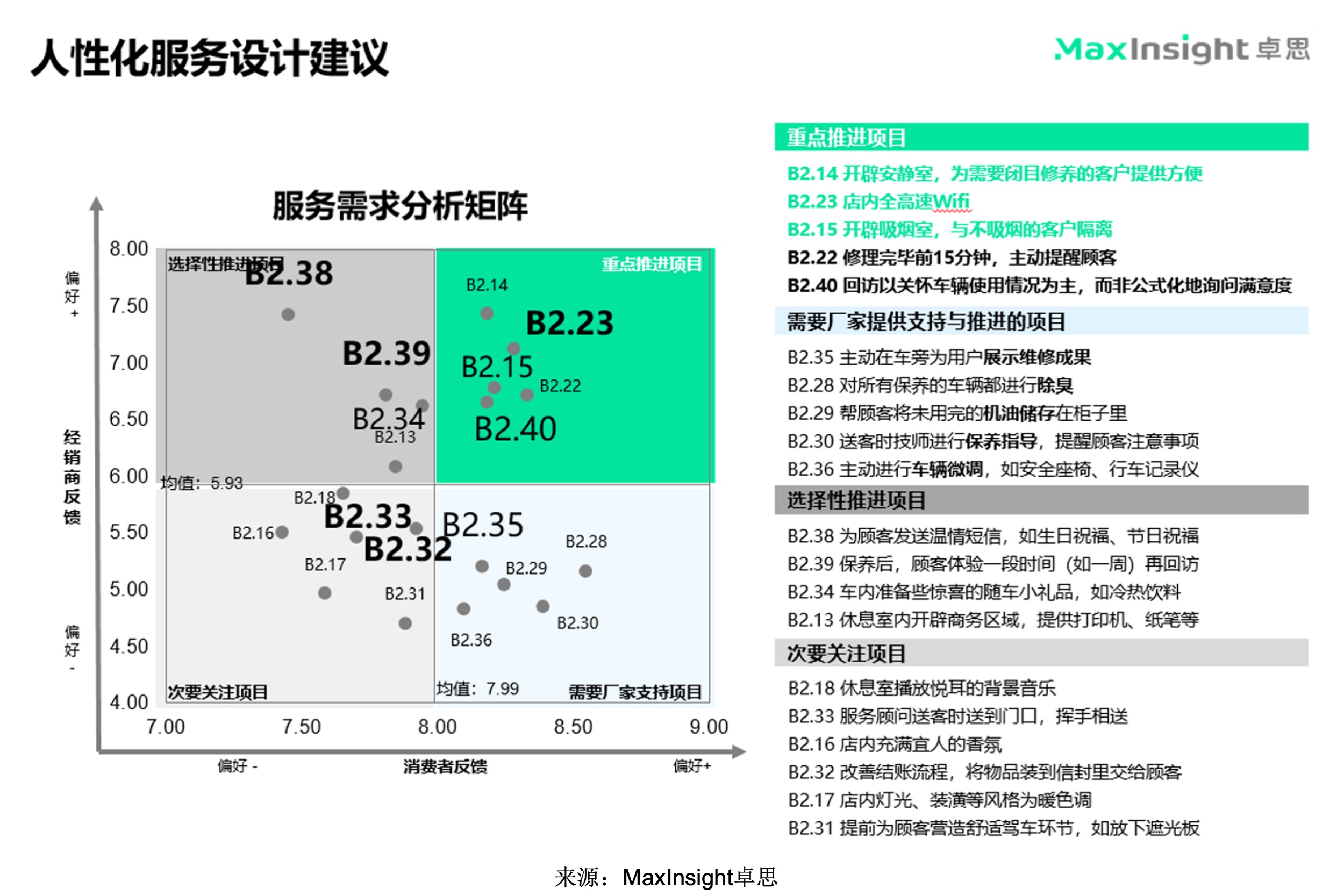 3)人性化服务:重点推荐项目包括开辟安静室为需要闭目修养的客户提供方便、店内全高速Wifi、开辟吸烟室等;需要厂家提供支持与推进的项目包括主动在车旁为客户展示维修成果、对所有保养的车辆进行除臭、存储客户未用完的机油等;选择性推进项目包括为客户发送温情短信、保养后及车辆体验后的再回访、准备随车小礼品等;次要关注项目包括休息室播放悦耳的背景音乐、改善结账流程将物品装到信封里交给客户等。