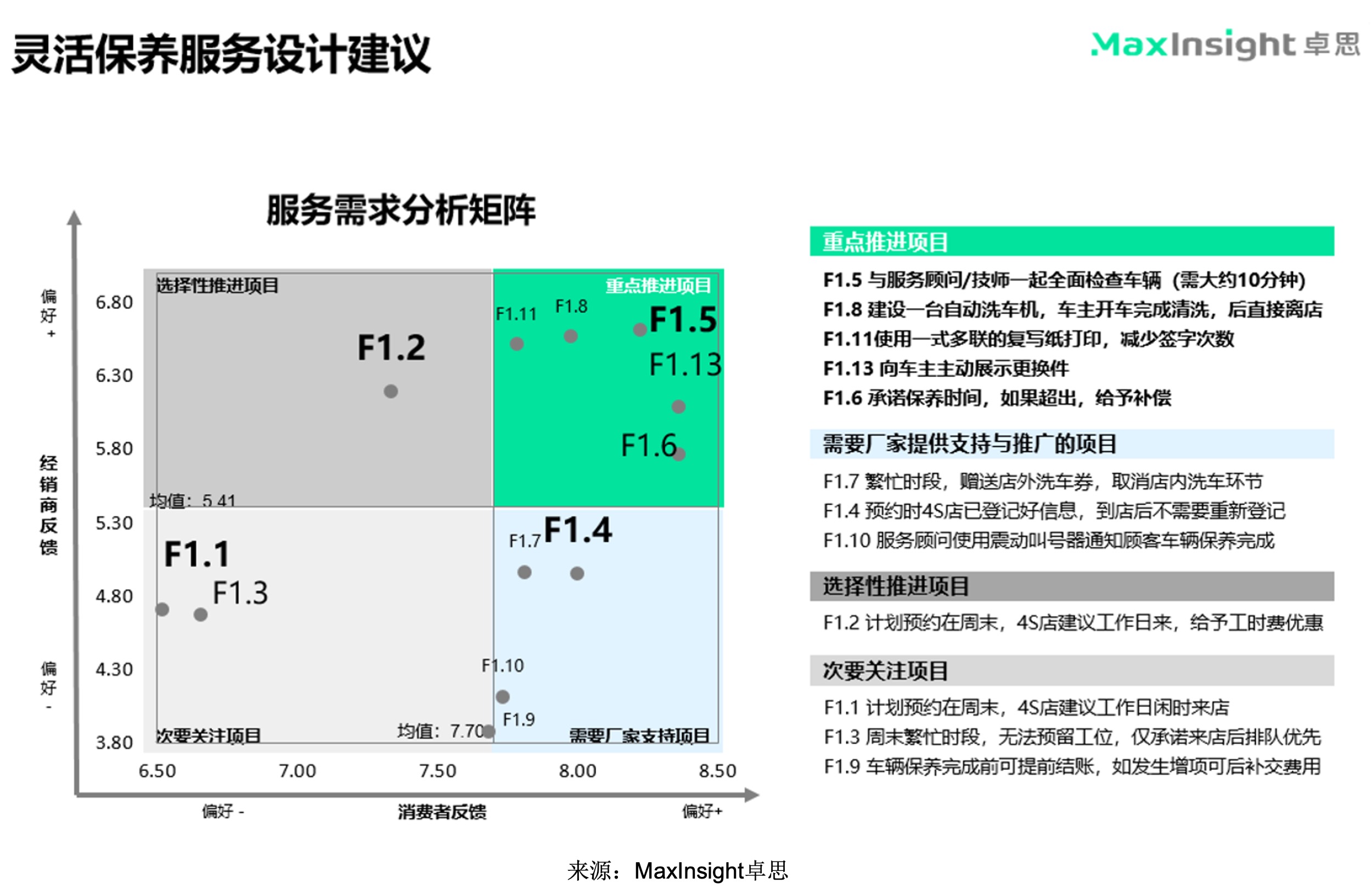 卓思将汽车售后服务需求矩阵划分为四大象限:重点推进项目、需要厂家提供支持与推进的项目、选择性推进项目以及次要关注项目。