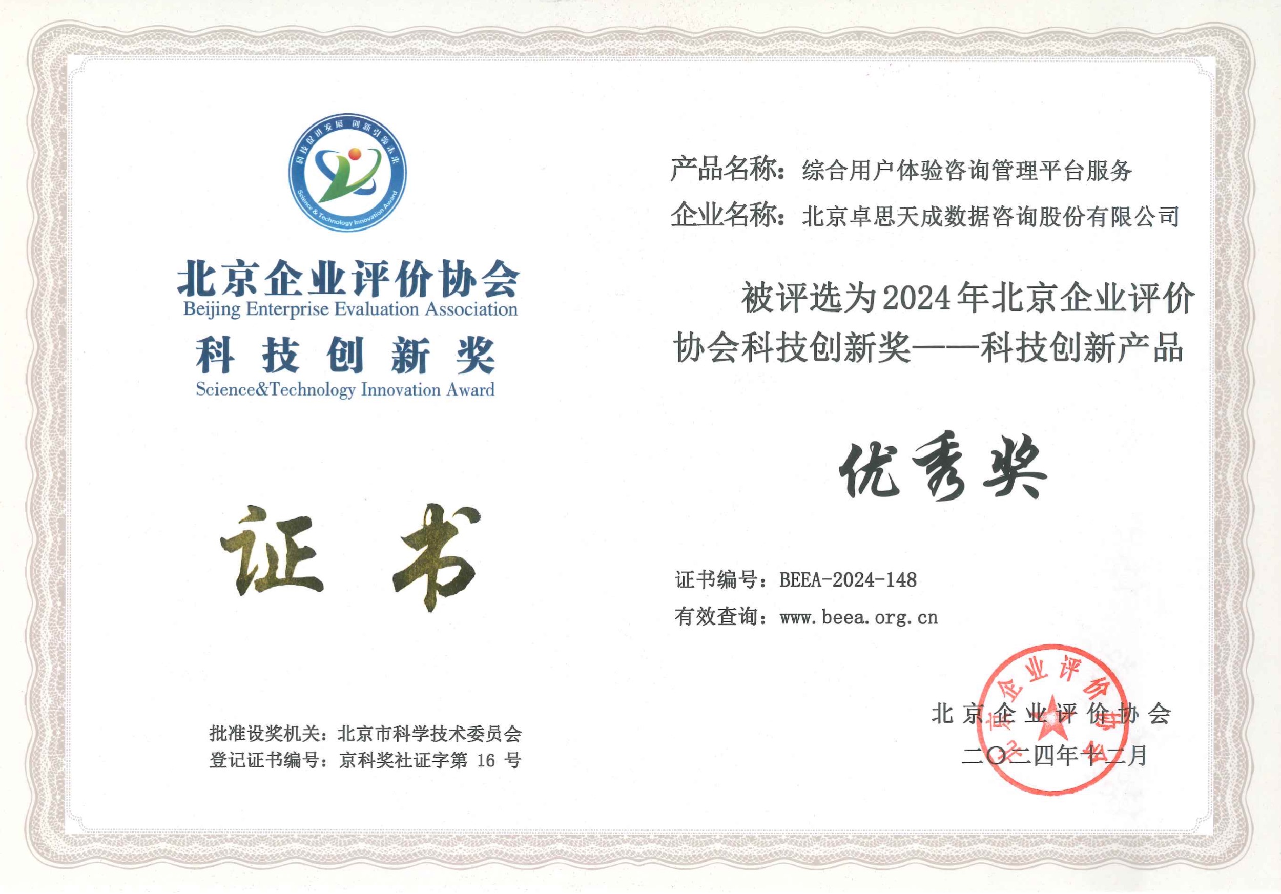 近日,北京市科委、北京企业评价协会公示“2024年科技创新奖”终审名单,北京卓思天成数据咨询股份有限公司(以下简称“卓思”)“综合用户体验咨询管理平台服务”荣获“2024年北京企业评价协会科技创新奖——科技创新产品优秀奖”。